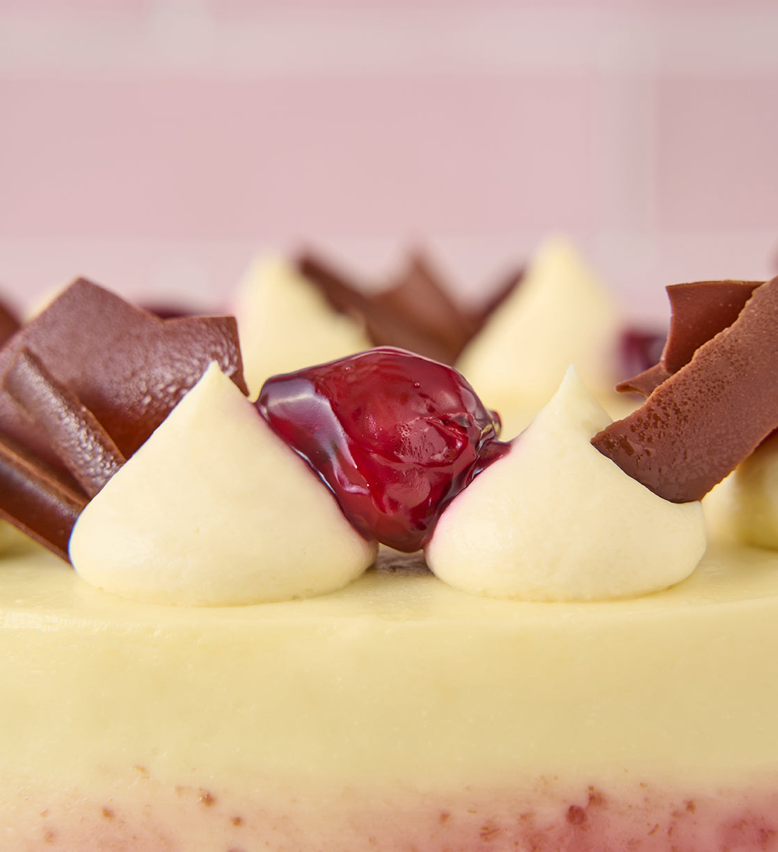 チェリージャム入りのチョコ生地、クリームの上にはチェリーコンポートを添えて